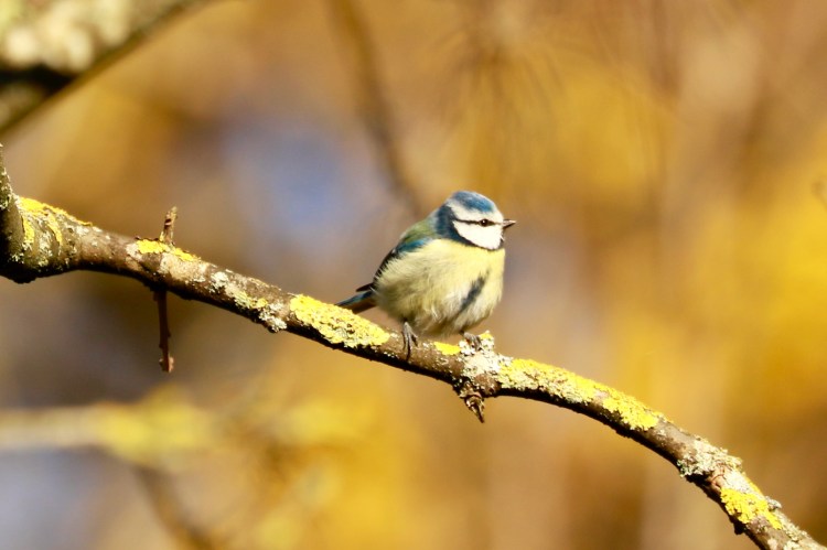 A Blue Tit sits on a branch absorbing the sun. Is is still about freezing but warming up fast.