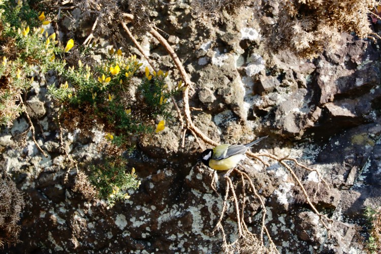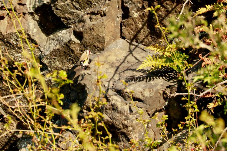 As I walk towards the first bend in the track I can hear three different birds singing on top of each other. The polite well pronouced secondary schoolboy call of “Teacher Teacher” from a Great Tit and the more squeaky primary school child call of “Teacher Teacher” from a Coal Tit. Amid it all is the anxious and stressed “Bother, Bother, Dammit Dammit” of Goldfinches. I locate two of the three by a rocky outcrop.