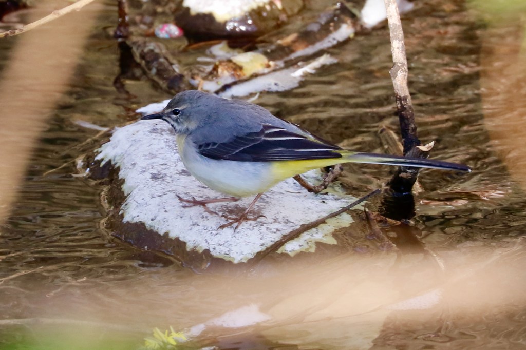 At the bridge across the burn by the Scout Hut I always check for Dippers and Grey Wagtails. They are often here and at this time they are pairing up and often seen together and sometimes I have seen the Dippers displaying. This time there are no Dippers but a pair of Wagtails fly through with their undulating flight and ridiculously long tails giving away their identity. I follow for the chance of a photo and prove lucky to focus on one between the branches before they fly downstream.