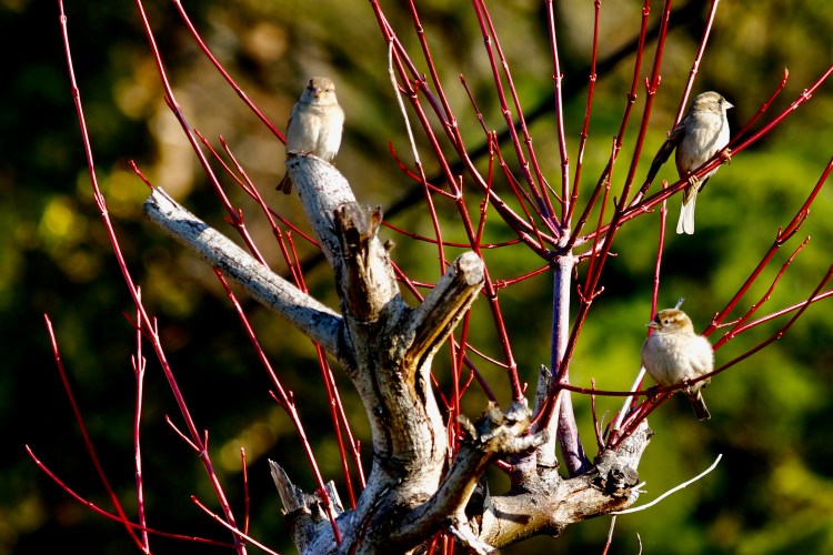 A Greenfinch wheezes in the distance as I return to the back-road spotting a Robin on the path and next to the old school a cathedral of House Sparrows cheep and chirrup from the hedge. Three females sit warming in the sun.