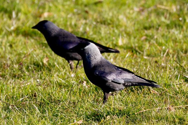 On the grass by the Fox-boy a pair of Jackdaws are strutting about. Clearly distinguished from their Corvid cousins by their grey colour, black cap and beady penetrating eye. For some reasons Jackdaws always seem to come in pairs like dating teenagers.