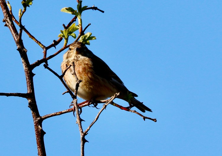 Just as I am thinking my walk is done one final gift. A Song Thrush and 5 Linnets fly overhead and land in a nearby shrub. Linnets are not rare birds but nor are they that common around here, the best spot of the walk saved for last.