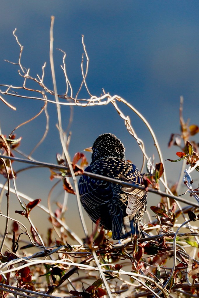 I know that the Starlings are there before I see them because of all the clicks and whistles. Their song is so other worldly, for some reason it reminds me of an old modem connecting in the days before broadband. I walk on and turn back to see the one bird reflecting the sun showing all the stars which gave it its name.