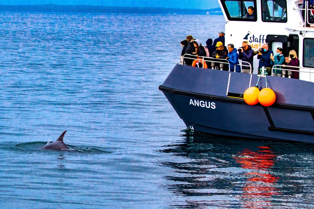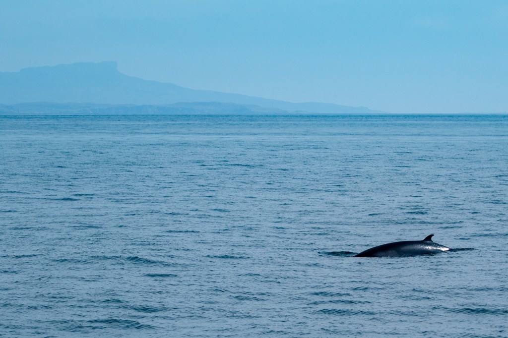 First, the modern, fast boat meant we could make the most of the four hours and travel from Mull via the Ardnamurchan Peninsular to the north of the Isle of Coll and subsequently travel up to the south of the Isle of Muck before returning to port. We pretty much travelled from one sighting to the next with very little downtime. Second, the boat was generously staffed with, in addition to the captain, a dedicated wildlife guide and a knowledgeable volunteer who both explained what we were seeing. They also tuned in to individual interests (for example, not everyone had my appetite for seabirds) and shared more information with those who wanted it. Lastly, we were very fortunate with the conditions as we had very little wind, flat water and this meant any cetaceans (aquatic mammals) were easy to see a long way off.