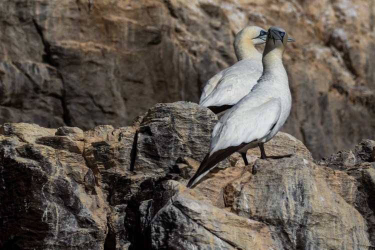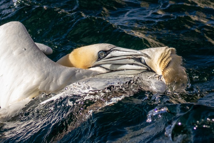 Gannets are actually highly territorial birds on the nest, albeit protecting a very small area. If a guga (Gannet chick) falls from the nest outside the territory the parents will no longer recognise it as offspring and therefore they will no longer care for it and it will perish. There is a clear line between their territory and that of their neighbour and if that line is crossed, warnings will be given and if they are ignored a fight will erupt. Mostly the fighting Gannets will fall into the water to continue the fight. These fights are often to the death as a Gannet beak is a formidable weapon. We saw one dead gannet being eaten by a Greater Black-Backed Gull following such a fight. We also interrupted a dramatic fight in progress.