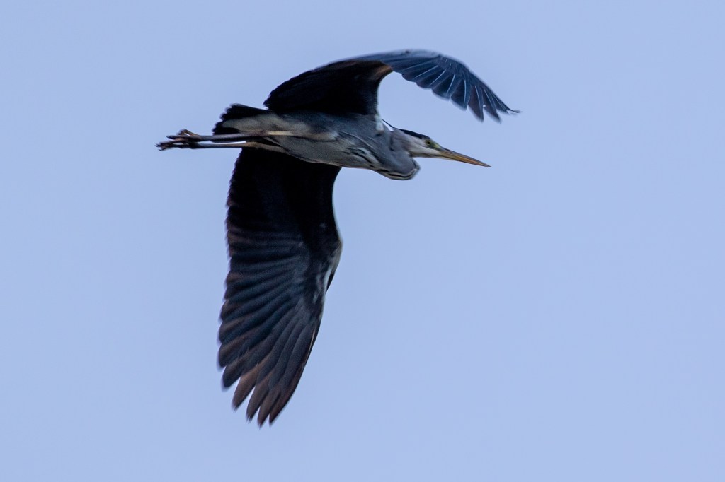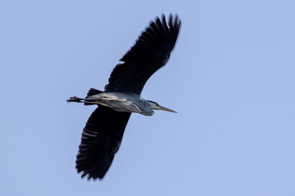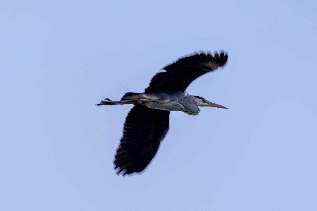 A Grey Heron flies over my head, its feet dangling behind it, before landing on the central island.