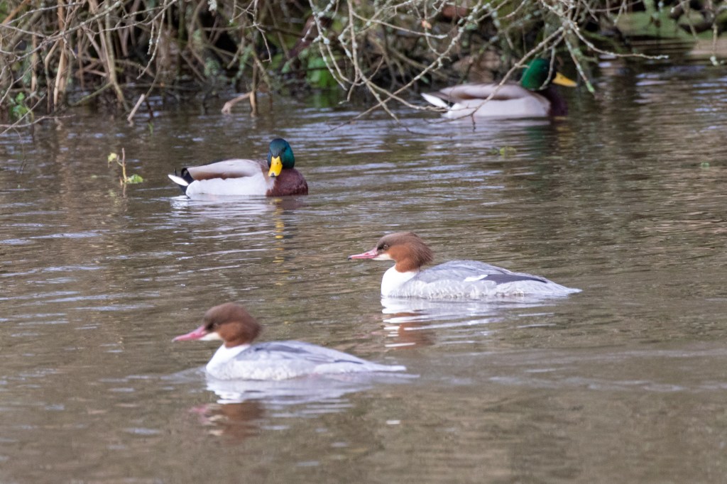 As we continue we see several Goosanders diving for fish. The male with its bottle green head and the female, equally attractive, with a reddish brown head. Both have a long hooked bill with strongly serrated edge, essential for catching fish on its diving forays.