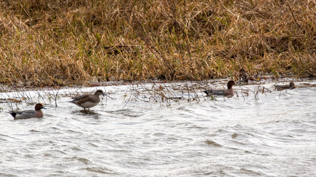 Reaching the far end of the loch a few Wigeon are gathered on the shore. The males standout with their central yellow head stripe, pinkish breast and grey back. The blandish females mainly told by association and the similar size and shape.