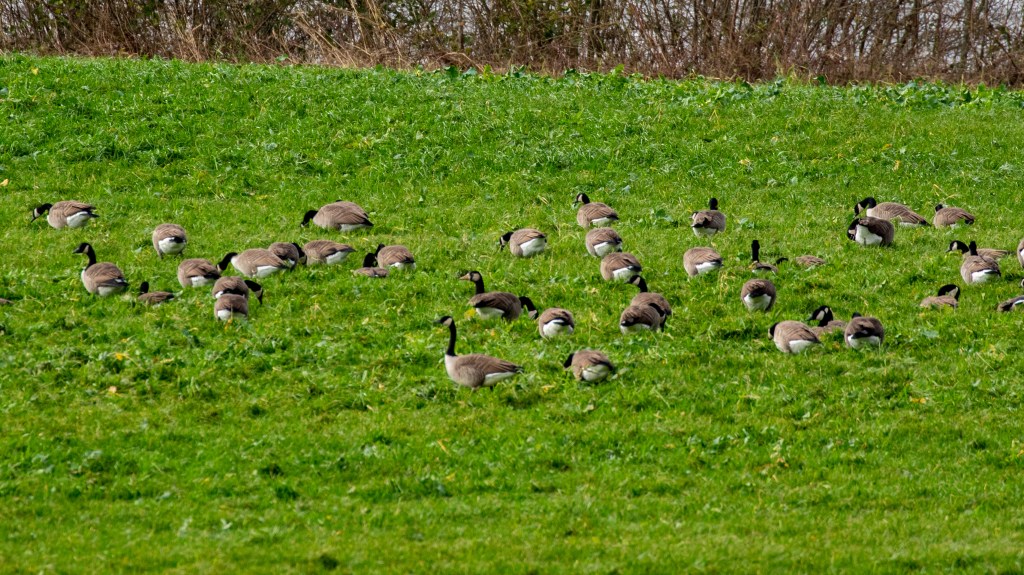 As we walk towards the farm at the East end of the loch I notice a large flock of Canada Geese feeding in the field. Along with Greylag’s these are plastic geese (introduced and resident) rather than the wild Barnacle, Pink Feet, Brent or White-Fronted Geese which migrate here each winter. I try not to despise the Canada’s because of their ancestry but not too hard.