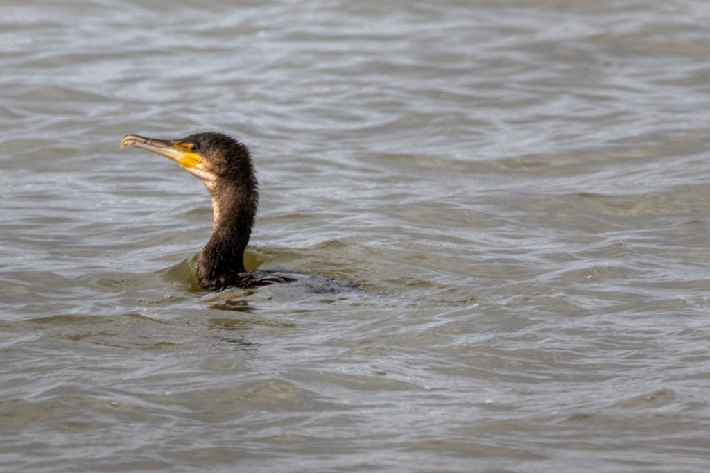 Reaching the South East corner we start heading back West. A Cormorant is fishing nearby. They rest so low in the water they sometimes appear all neck and head with no body.