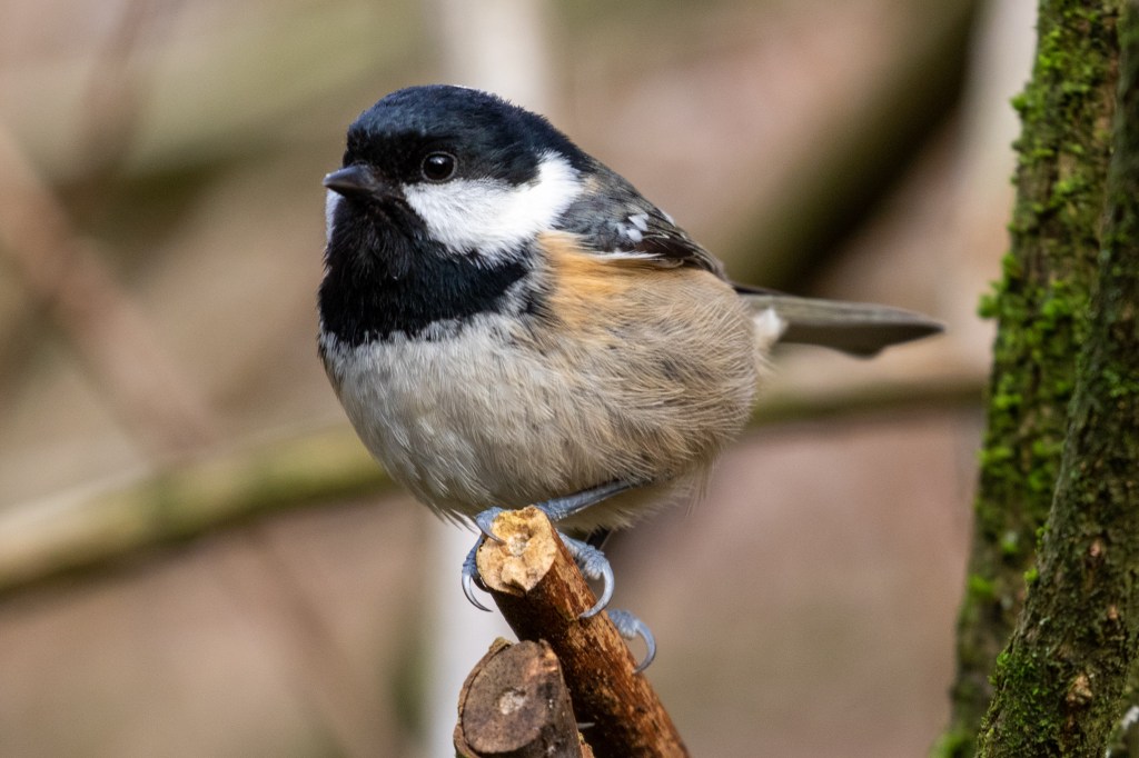 Stopping at the garden with bird feeders, a lovely Coal Tit moves around the nearby shrubs, impressive claws on display as it watches me.
