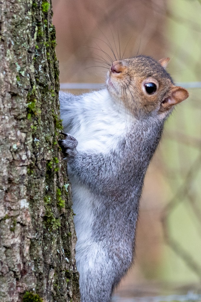 We are back at the car now and as we are driving we notice a few Grey Squirrels chasing each other before pausing on the tree trunk to allow a photo and then they are off again.