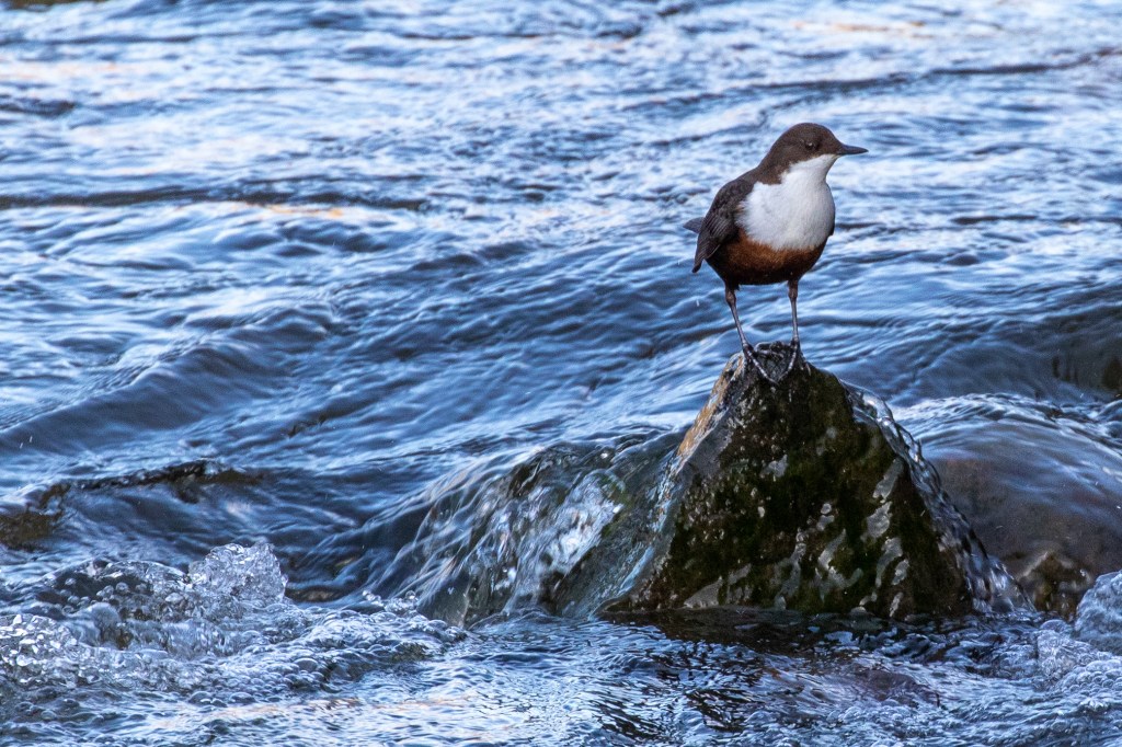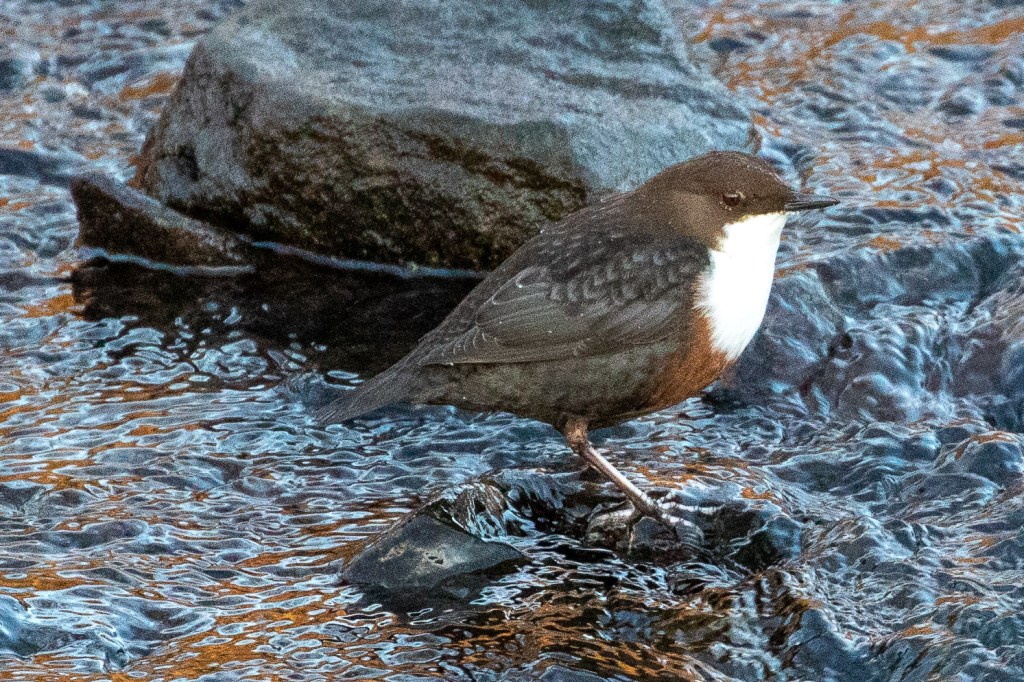 It is then joined by one of my favourite birds the Dipper. I often spot the bold white bib in the shadows or just the movement as it habitually bobs up and down or dives in and out of the water preferring to find its food at the bottom of rivers and streams. The combination of black, white and chocolate brown make this an unmistakable and striking bird. It is well named too.