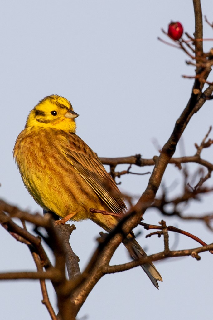 The Yellowhammers have mostly been absent around the village over the winter preferring to go down to Tullibody Inch where I counted 120 last winter roosting together by a cereal crop field. But on this walk I see my first this far up stream of the year. A striking male cheeping from the top of a large Rosehip.