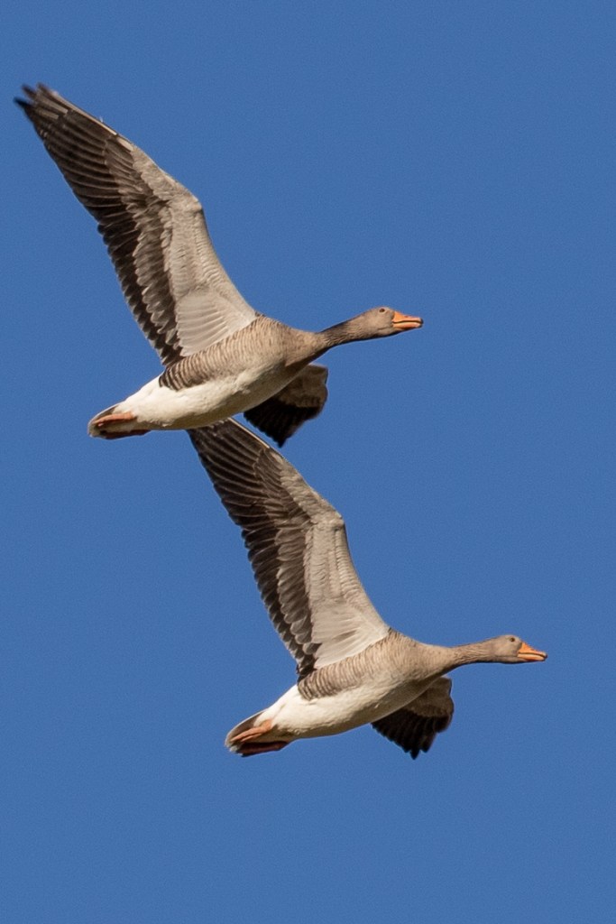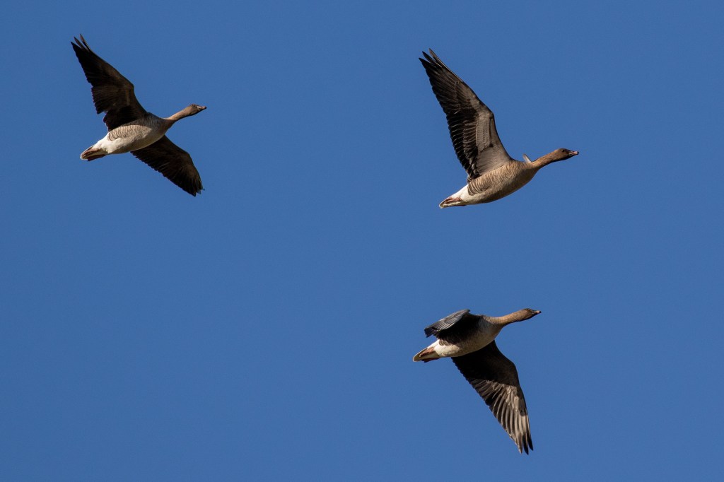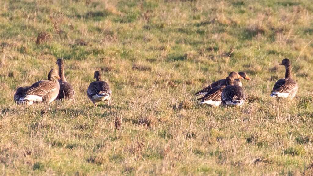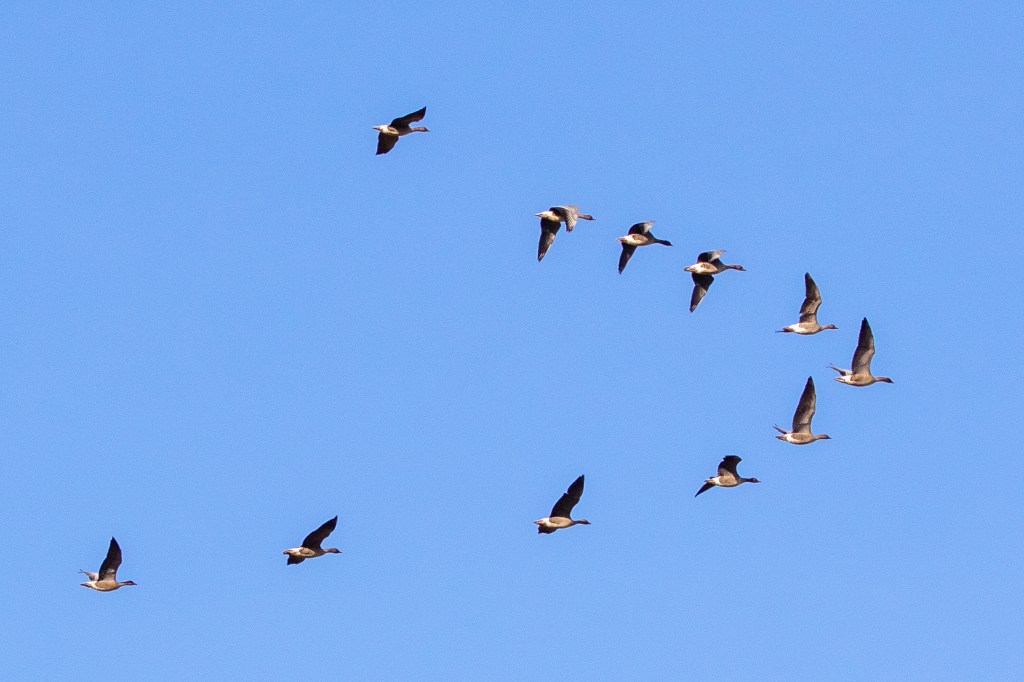 Far more enjoyable for me is having hundreds of Pink Footed Geese fly over. This is a winter only sight as these birds will soon be heading north to Iceland to breed. Here you can see the smaller less colourful bill and dark heads which identifies these as Pink-Footed Geese.