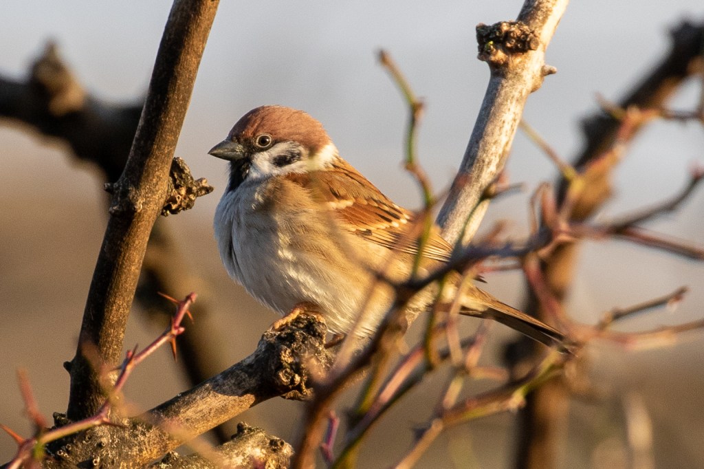 As I head back to Menstrie the hedgerow has one last treat for me. I hear the chirping of sparrows and am pleased to see that there are several Tree Sparrows around. The country cousin of the much more common House Sparrow distinguished by their solid brown cap.