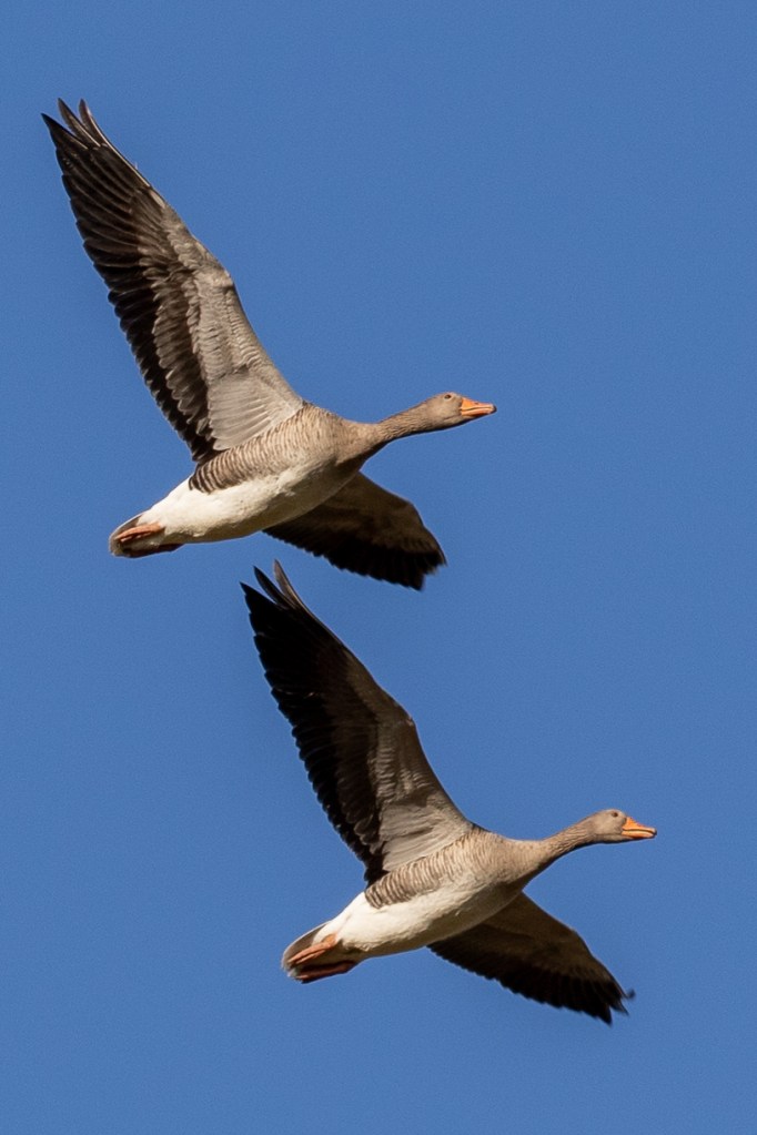 A classic winter sight and sound is Geese flying over. On this walk I see some small flocks of Greylags, and one is close by for good photos of a fine pair. Here you can see the strong orange beak which tells them apart from Pink Feet.