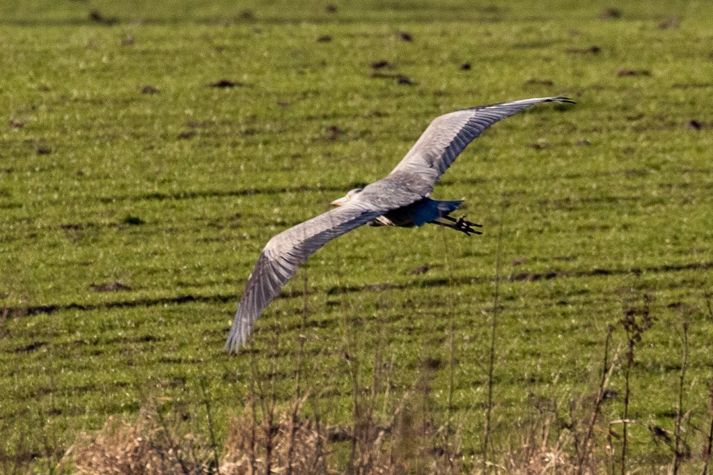 I accidentally disturb a Heron which lifts up and flies a couple of hundred meters downstream before landing in a field on the opposite bank.