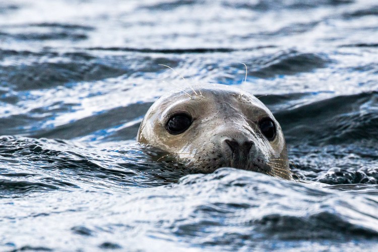 As we approached the Island we saw some Grey Seals hauled out on the rocks and one inquisitive individual approached the boat. I used spot focus and a fast shutter speed to focus on the seal and freeze the motion of the animal and the water.