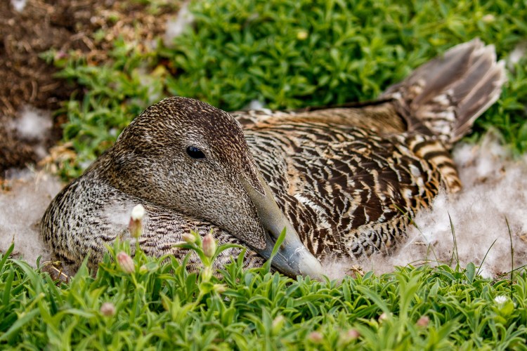 The idea of being stranded on the Isle of May for a night was quite attractive but I did have a boat to catch. It was time to leave but as I decided to head back to the boat I noticed I was stood about 1 foot from an Eider Duck on a nest of soft down right by the path. Well if you insist, one more photo.