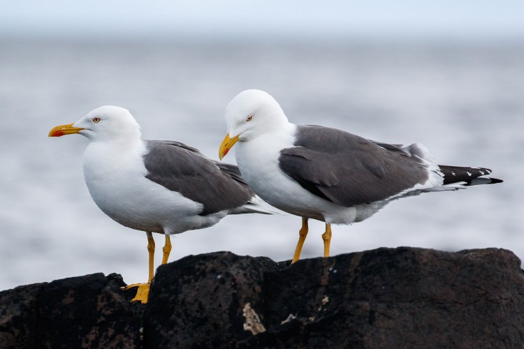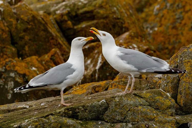 As we came into the small harbour there were several gulls and terns around. I noticed Herring Gulls fondly displaying to each other and a pair of Lesser Black-Backed Gulls watching dispassionately from their rocky perch. This was easier conditions to take photos as now as the boat was on calmer water. With the displaying birds I shot a burst, the shot I chose has one gull with bill open and raised, this seems to capture the moment well for me