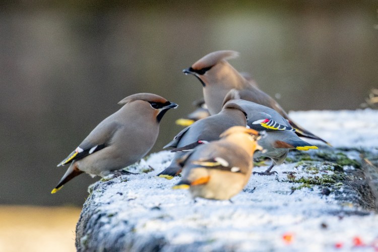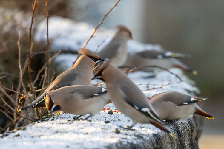 Perhaps more unexpectedly they were also coming down to a wall, landing on the snow and appearing to eat the snow. I wasn’t sure what this behaviour was about but certainly didn’t mind it as it gave me an opportunity to take photos at eye-level with the birds and also experiment with different depth of field. They were constantly moving so often it was hard to get them in focus. The Waxwing gets their name from the colourful wings which look like they have been dipped in candle wax.