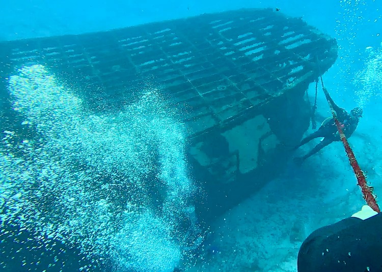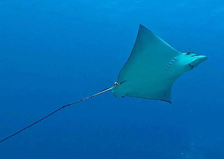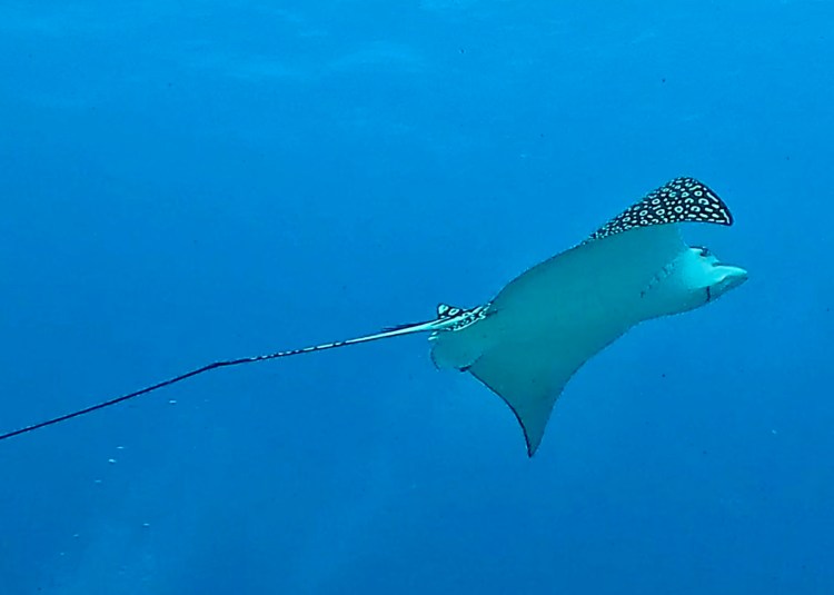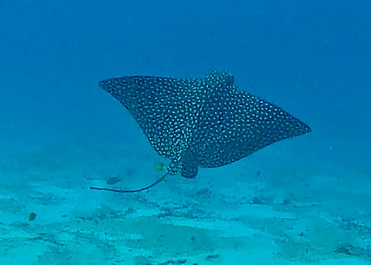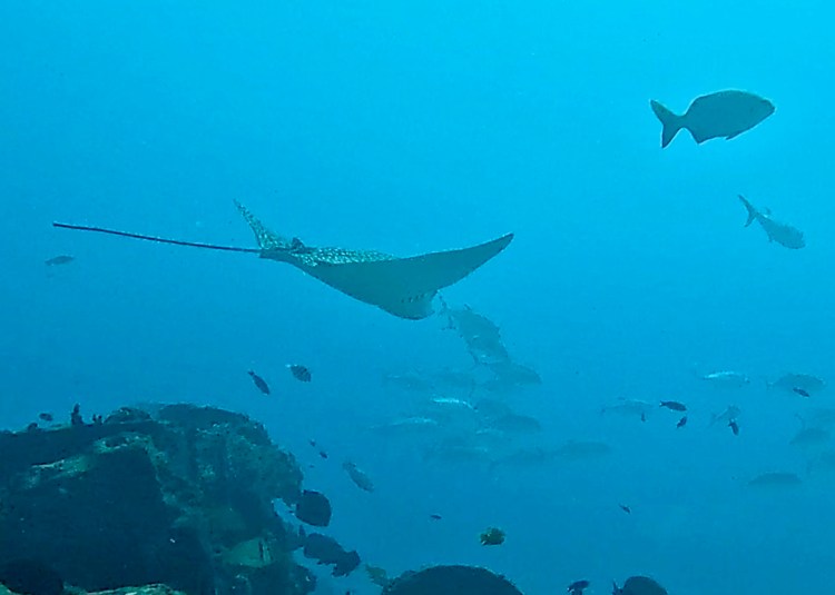 The final dive I took the camera for was much deeper to 22m to the site of Gunboat C-55 a wrecked military boat which was scuttled in 2000 to provide a dive site. Since then it has become a meeting point for the critically endangered Spotted Eagle Rays. Sadly because they are overfished in Asia and elsewhere. These rays measure 3m wingspan by 5m length (including tail). We saw at least 9 on the dive as well as explored the wreck a little bit.