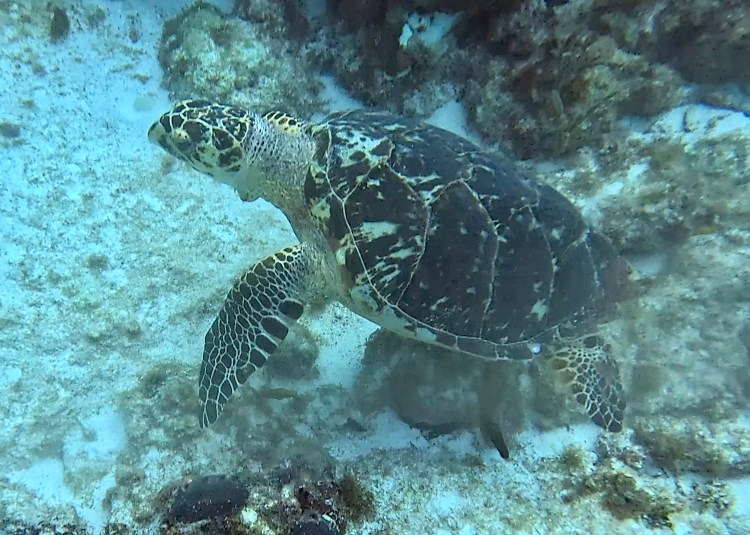 One of our early dives was to about 9m (27ft) on Manchones Number 2 Reef. Here we saw a wide range of wildlife including several Sting Ray’s emerging from the sand, Angelfish, Lobster, large shoals of Grunts, and a Hawksbill Turtle