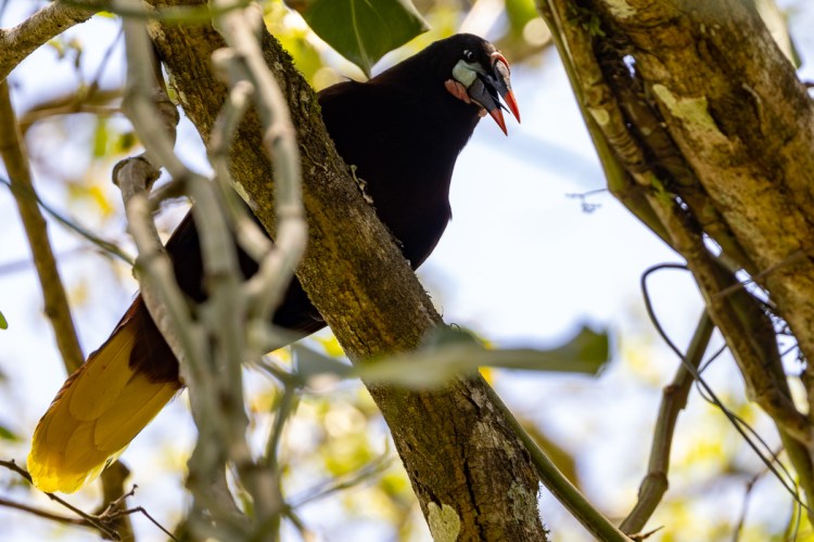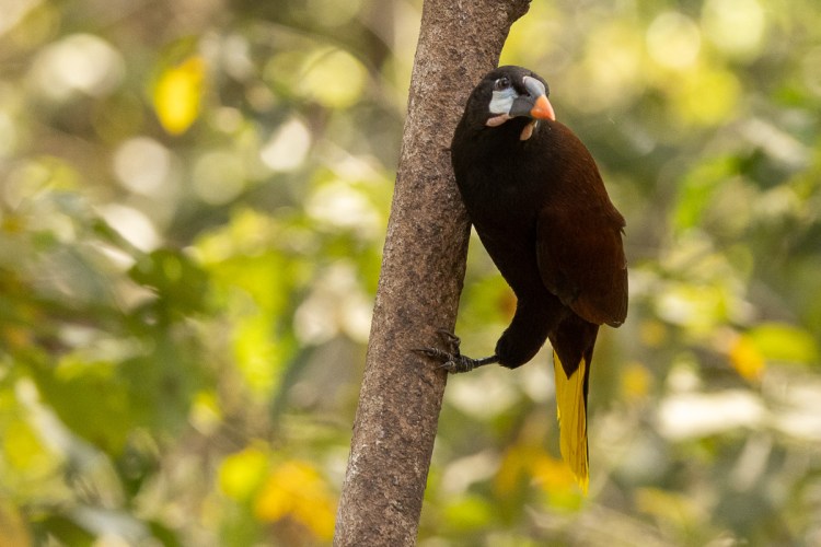 We kept seeing the distinctive profile of Montezuma Oropendola’s flying overhead (yellow surrounding outer feathers on tail). Before long we found out why as there was a large nesting colony nearby. These birds build incredible nests which reminded me of the African Weavers.