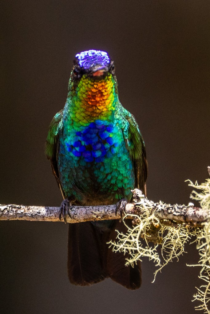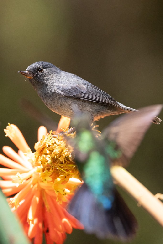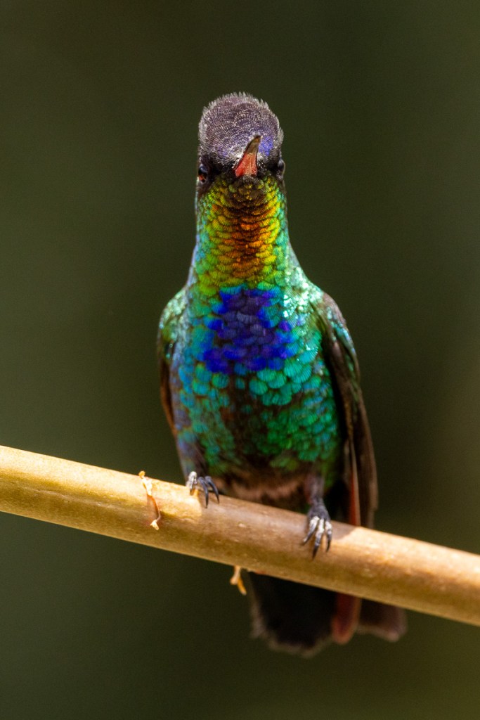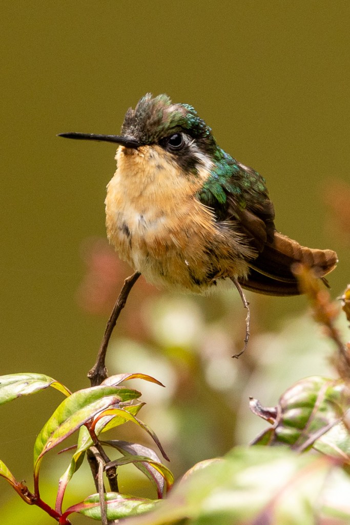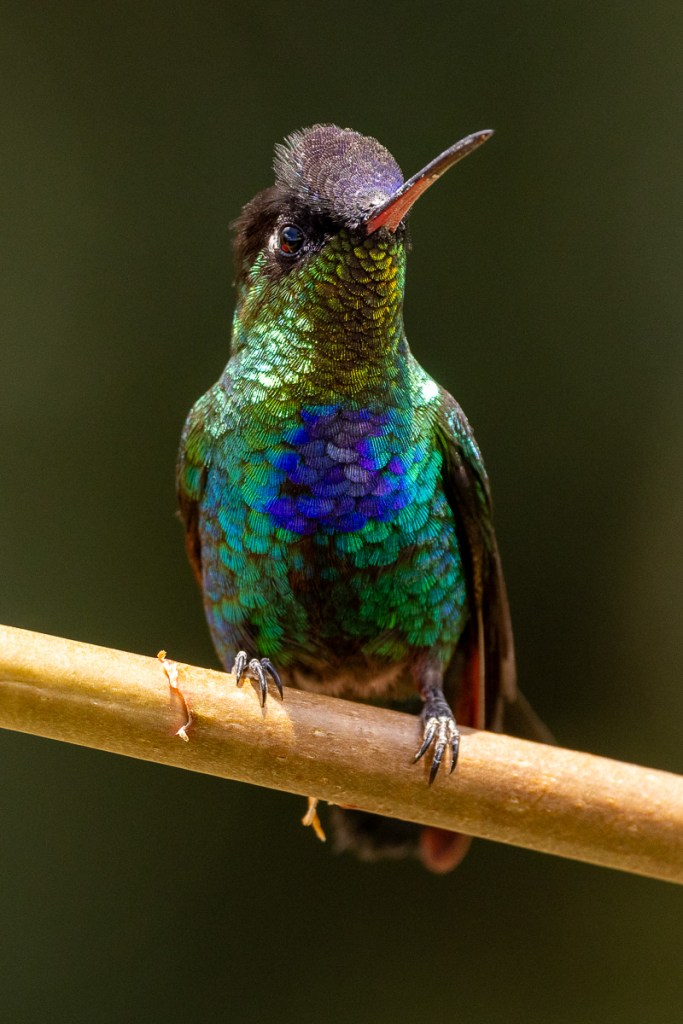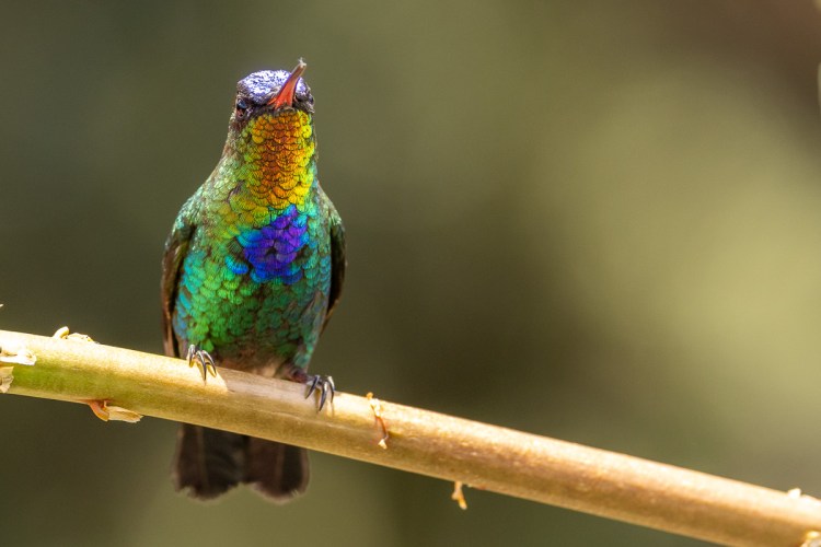 After saying goodbye to the guide we purchased an expensive coffee (US$4 each) and spent a happy half hour at the hummingbird feeders. I focused mainly on the brilliant Fiery-Throated Hummingbird which in a sudden turn of angle could turn from a fairly drab green to a fantastic array of fiery throat and blue chest. A fantastic wee bird. A Slaty Flowerpiercer also put in an appearance demonstrating its feeding technique using its unique bill. Instead of taking nectar from the top of a flower it pierces a hole at the base and drinks its fill.