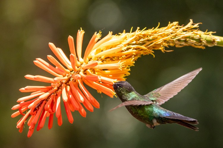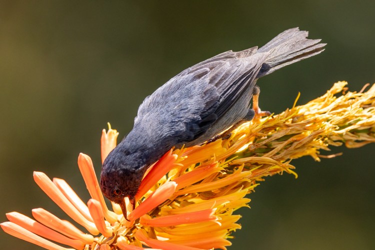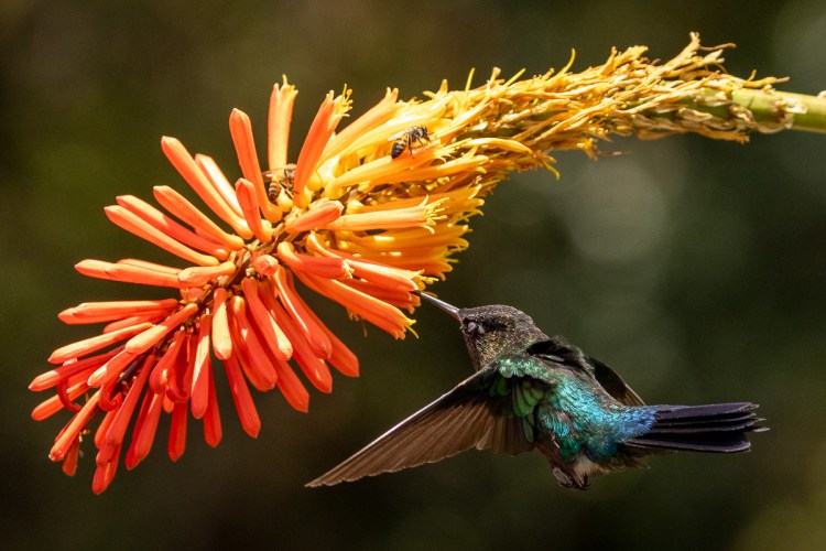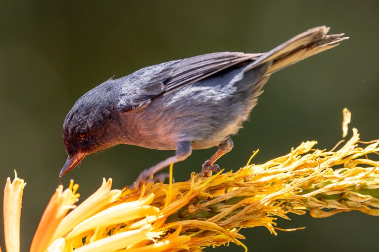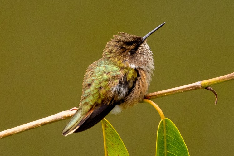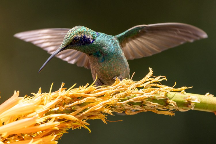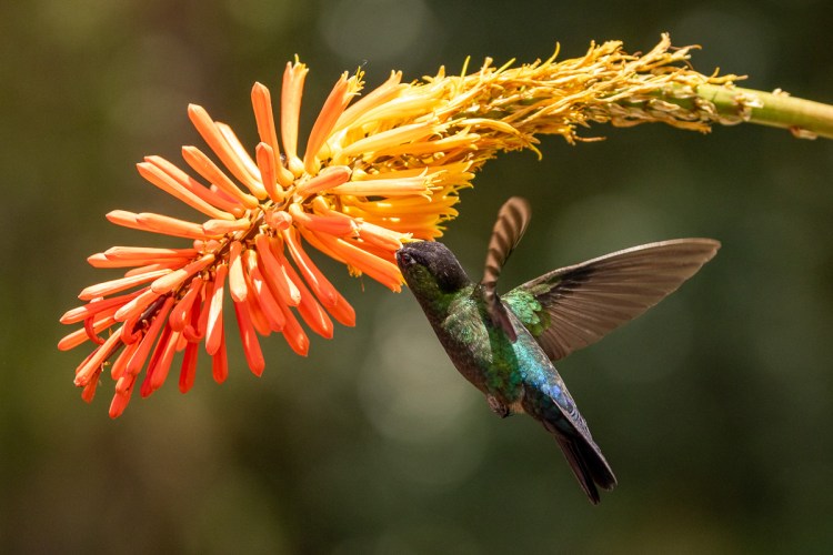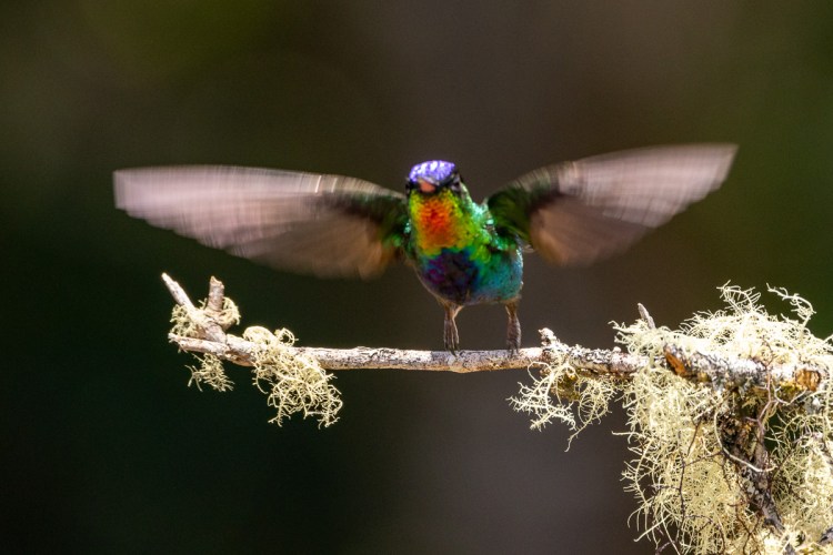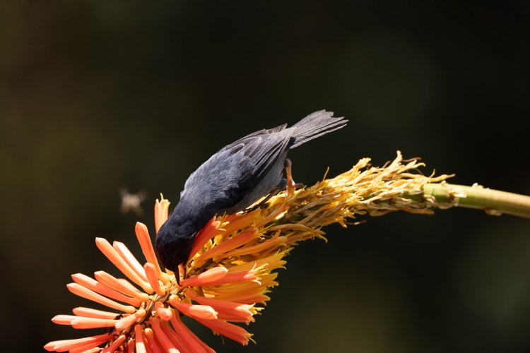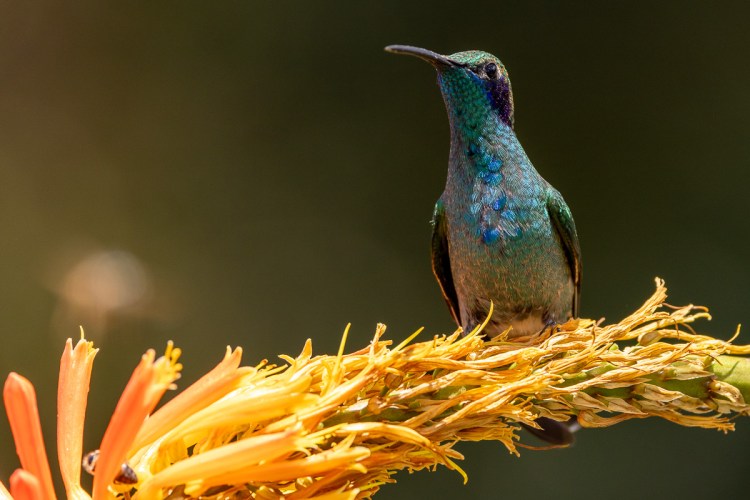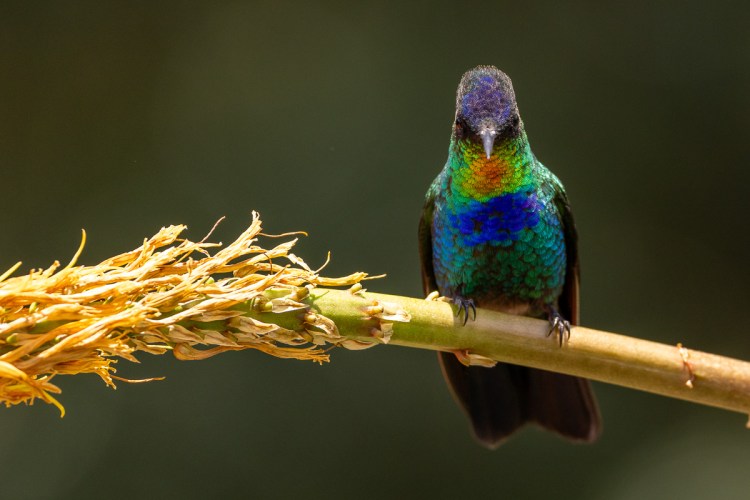After saying goodbye to the guide we purchased an expensive coffee (US$4 each) and spent a happy half hour at the hummingbird feeders. I focused mainly on the brilliant Fiery-Throated Hummingbird which in a sudden turn of angle could turn from a fairly drab green to a fantastic array of fiery throat and blue chest. A fantastic wee bird. A Slaty Flowerpiercer also put in an appearance demonstrating its feeding technique using its unique bill. Instead of taking nectar from the top of a flower it pierces a hole at the base and drinks its fill.