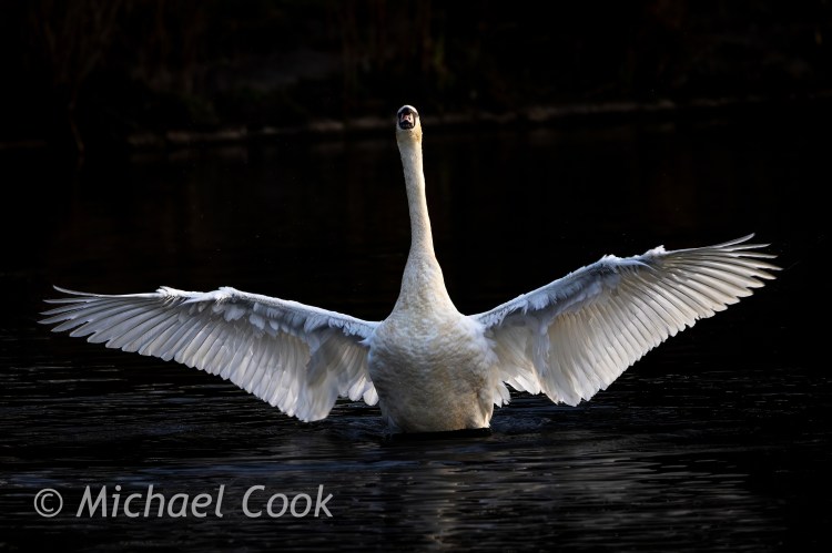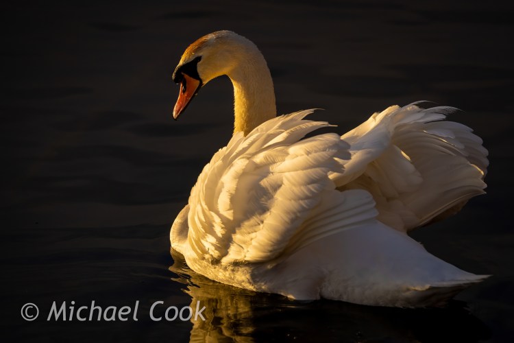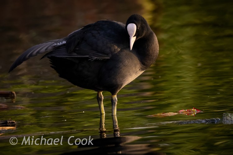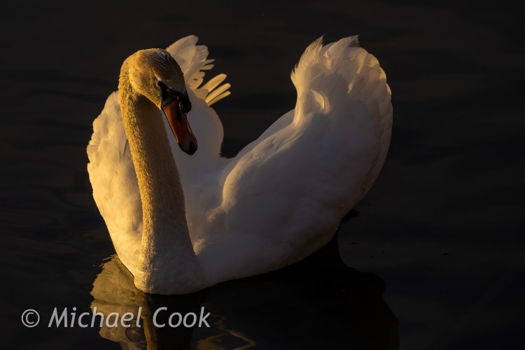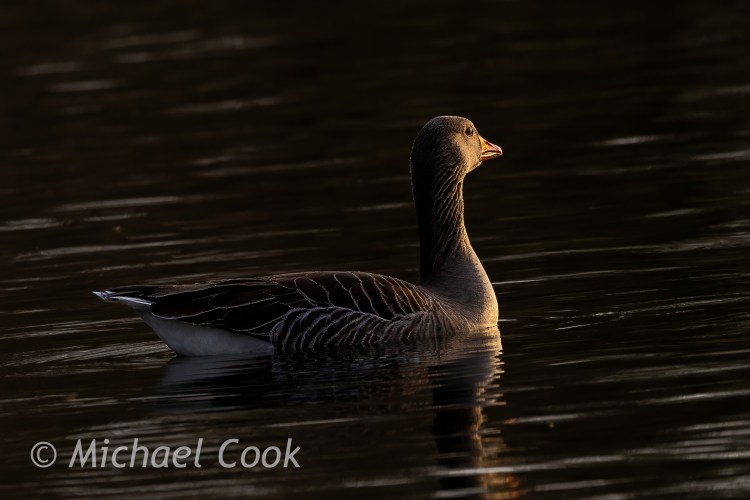 In the same dark area a white swan really popped on the dark background. Waiting for the warm lighting to hit a dark coot was more of a challenge whilst side light on a Greylag also was helping me to tune into the light and conditions.