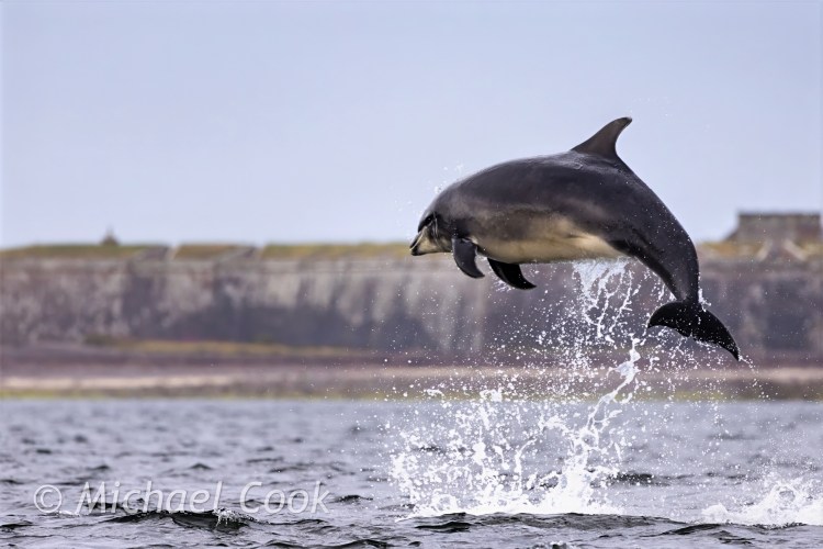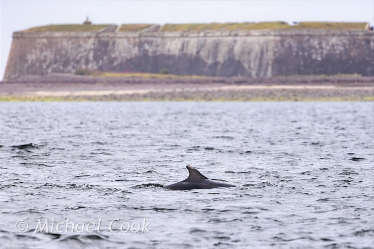 This second reason is good news for the wildlife photographer. The Moray Firth narrows just east of Inverness where two points create a meander in the river. From the south the mighty Fort George is built on the outer point of the southern bank. From the north a strange promontory ending in Chanonry Point sticks out. Several factors combine after low tide to cause the Salmon to pause here when swimming up stream. The flowing river meets the incoming tide at this narrowing and creates an invisible barrier that the Salmon struggle to cross so they wait for the tide to build and provide support for easier going. As the numbers of Salmon build the Dolphins come in to hunt them. And the wildlife photographers to shoot the Dolphin.